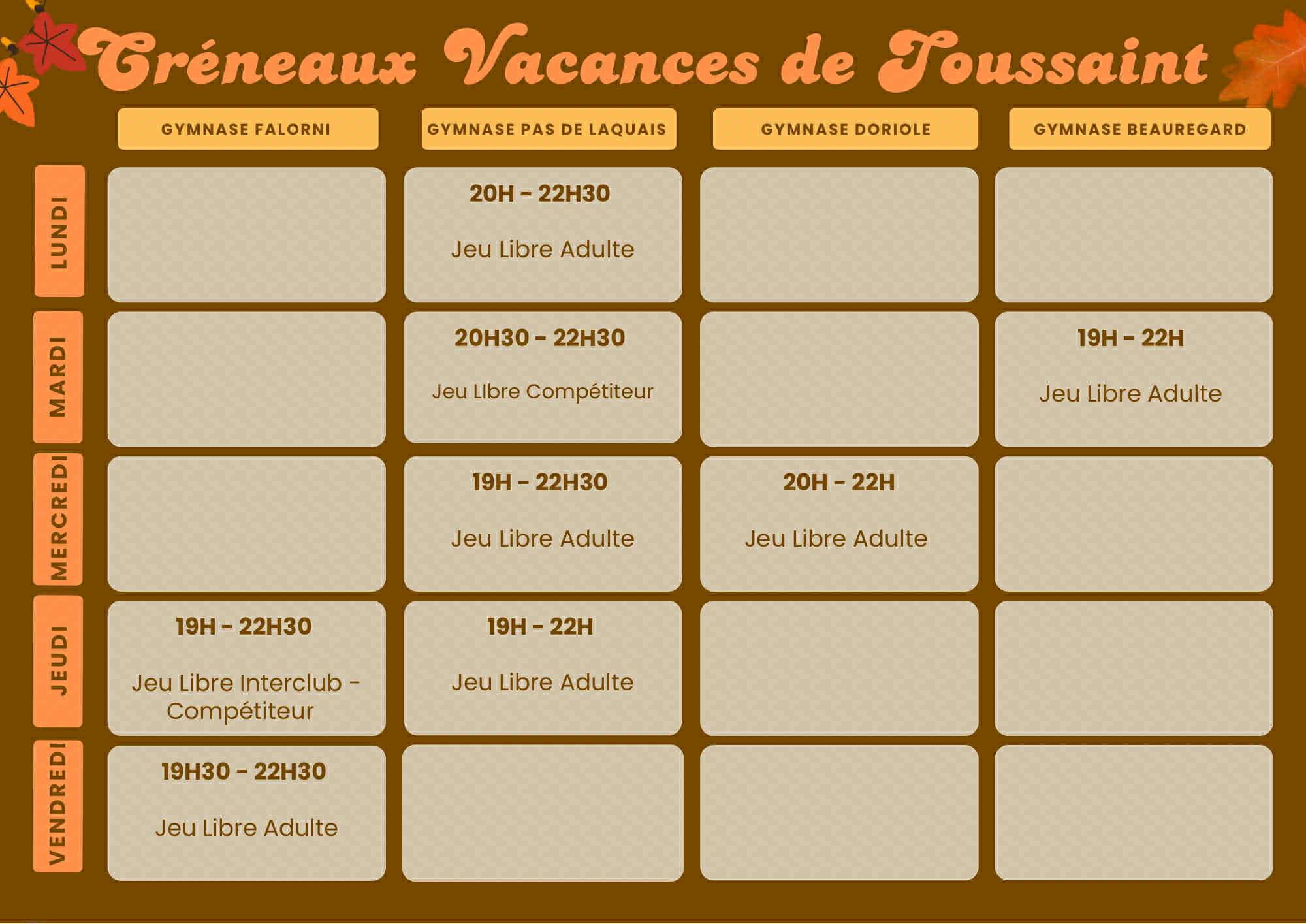 Le bad continue pendant les vacances de la Toussaint. Vous trouverez la liste ci-dessous des créneaux disponibles pendant les vacances.